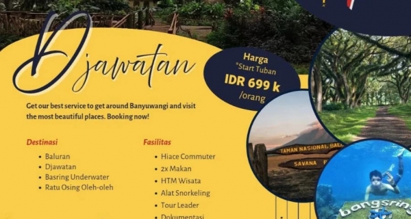 Wisata Explore Banyuwangi akan kita awali dengan mengunjungi Africa Van Java yaitu Taman Nasional Baluran,dilanjutkan kita akan melihat keindahan biota bawah laut Snorkeling di Bangsring under water,Hunting Foto dan vidio di tempat yang Aestetik dan magical banget yaitu hutan Trembesi Djawatan Benculuk